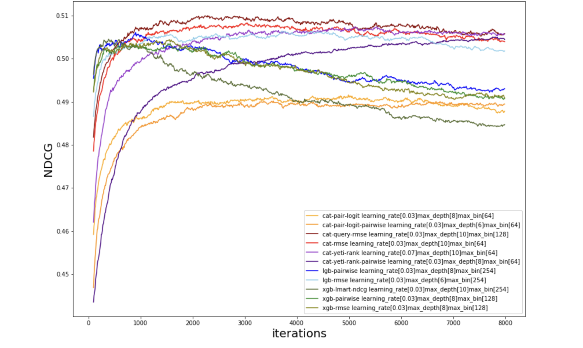 It can be seen that CatBoost outperforms LightGBM and XGBoost in all cases. More details of the ranking mode variations and their respective performance metrics can be found on CatBoost documentation. These techniques can be run both on CPU and GPU.